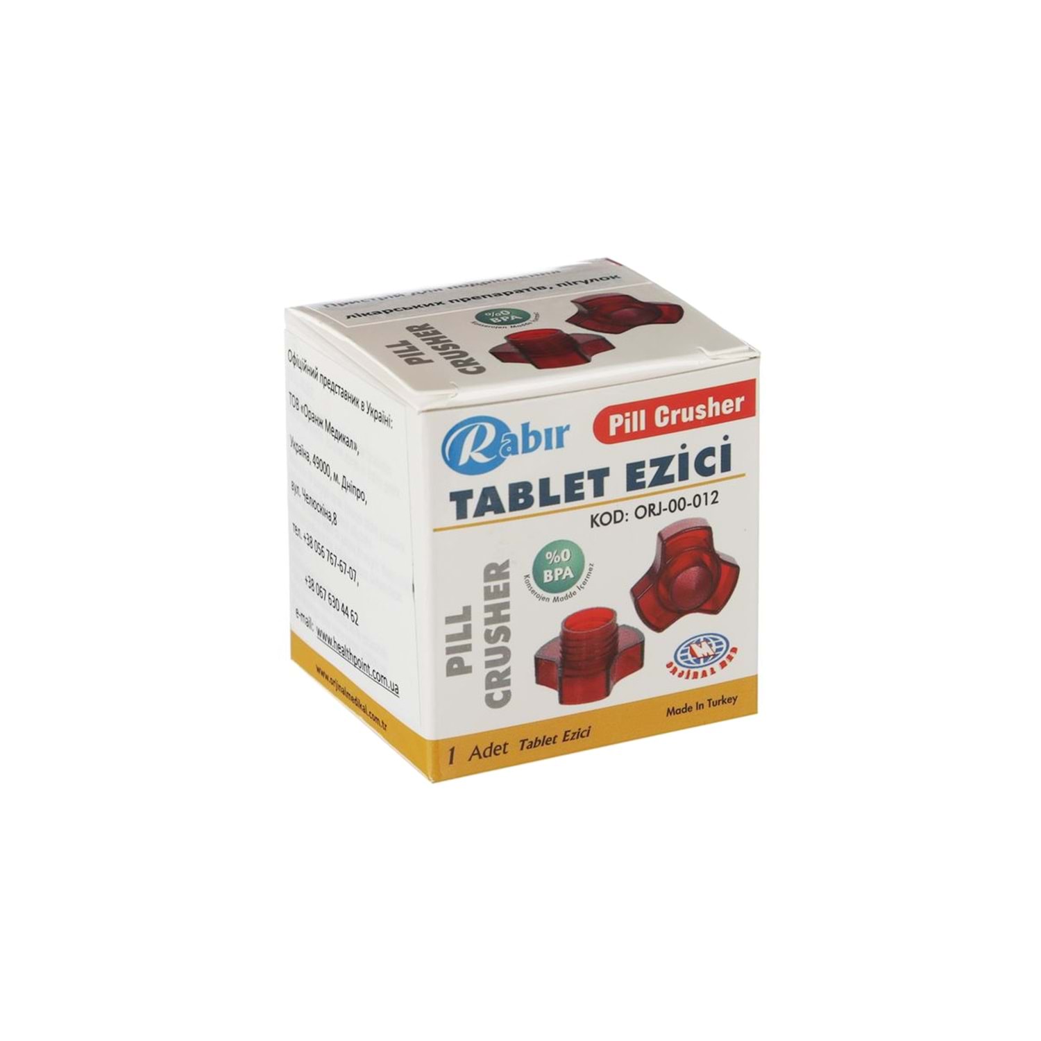 Rabır ORJ-00-012 içerisine konan tableti ezerek toz şekline getirmek için kullanılan bir üründür. Bu ürün özellikle yutma güçlüğü çeken hastalarda ve toz şeklinde alınması gereken ilaçları alırken kullanılır. Kullanmadan önce kişi doktoruna alacağı ilacın toz halinin kullanılmasının uygun olup olmadığını danışmalıdır. Rabır ORJ-00-012’nin yapısı gıda ile temas edebilen materyalden oluşmaktadır. Ürün musluk altında su ile yıkanabilir. Çocuklardan uzak tutulmaya özen gösterilmelidir.