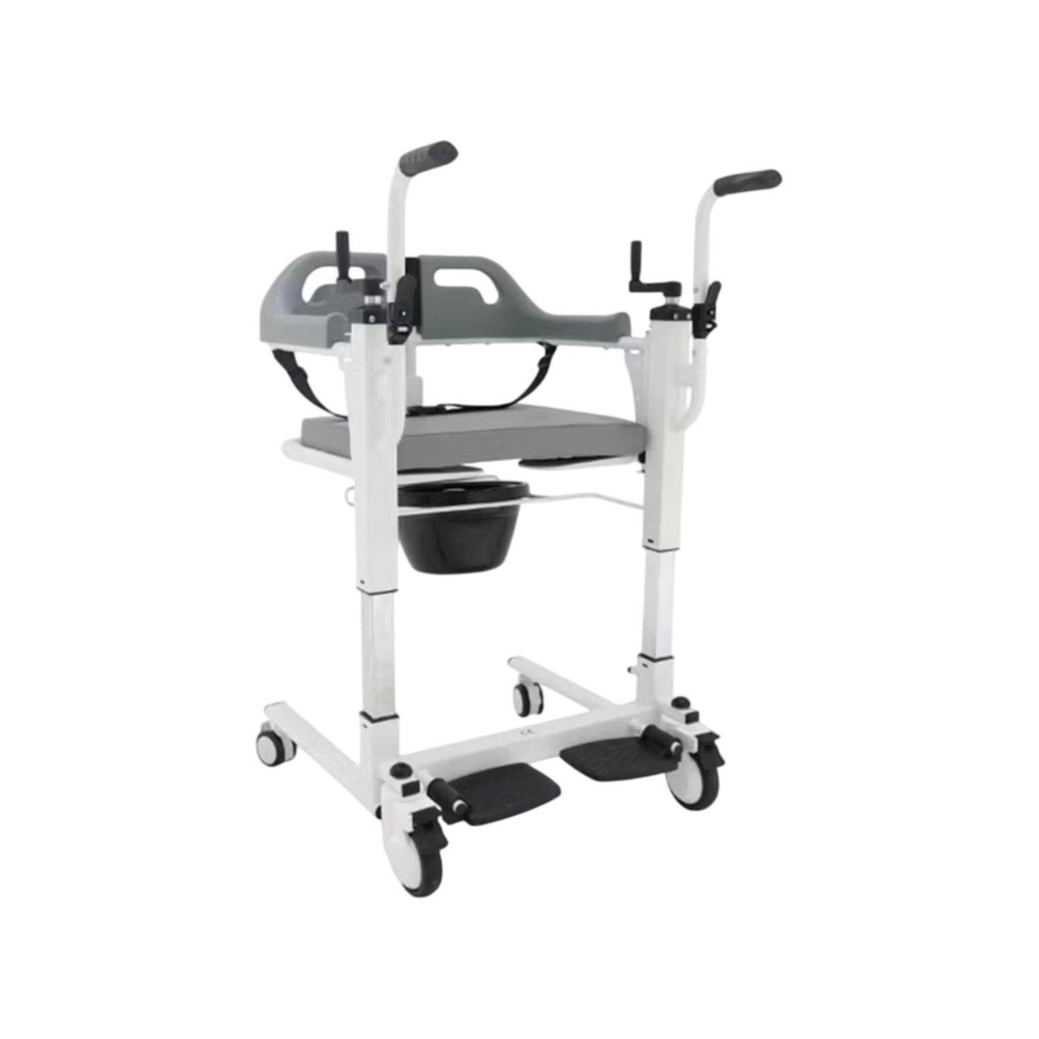 Ürünün sırt ve oturma mekanizması 180 derece yana açılarak, hastayı ayağa kaldırmaya gerek kalmadan kolayca altına yerleştirilebilir. Ön kısmında bulunan manuel çevirme kolları sayesinde yüksekliği ayarlanabilen gövde yapısı, farklı yükseklikteki yataklara ve standart klozetlere tam uyum sağlar. Dört tekerleğinde bulunan fren sistemi ve kilitlenebilir sırt mekanizması, transfer sırasında cihazın sabit kalmasını sağlayarak kullanıcıya üst düzey güvenlik sunar.
